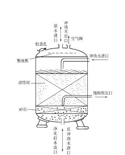 可以一個(gè)塔或幾個(gè)塔并聯(lián)或是串聯(lián),操作可間歇或切換使用。為防止裝置濾層的阻塞,要定期反沖洗,在活性炭上部設(shè)置表面沖洗設(shè)備。