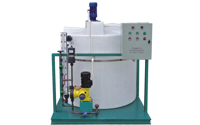 本裝置主要包括藥液溶配系統、計量投加系統、安全系統和控制系統等四部分。固體藥劑加入溶藥箱中,然后按比例加入工業水攪拌溶解,由計量投加系統投加到投藥點。投加控制采用手動方式,也可依據上位系統輸出的控制信號,進行隨動控制,自動投加。